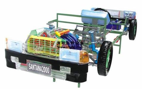 本品選用透明有機玻璃制作,內(nèi)中部件均以硬質(zhì)塑料料加工,用 螺絲固定在金屬高溫烘漆而成的車架上。各總成部分都以壓模成形加 工,代替過去膠粘合的方法,使產(chǎn)品在強度上有很大提高。發(fā)動機總成用電機驅(qū)動,在油門處設(shè)有調(diào)速裝置,能演示發(fā)動機轉(zhuǎn)速高低。離合器分離明顯,操縱靈活,離合器外殼整體壓模而成,變速箱和各檔齒輪用各種顏色表示,換檔靈活,手制動美觀。后橋外形壓模而成,內(nèi)中主減速、差速轉(zhuǎn)動自如,輪轂剎蹄壓模成型,剎蹄可調(diào)節(jié),前橋輪鼓可調(diào)整,轉(zhuǎn)向裝置以及電瓶、油箱、水箱,制動管路分布清楚一目了然。電路采用對插件前后分布,燈架、風(fēng)窗、儀表板、后燈架用透明有機玻璃壓模成整體美觀逼真。