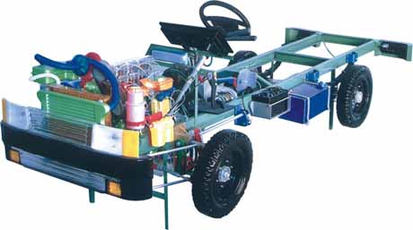 本品選用透明有機(jī)玻璃制作,內(nèi)中部件均以硬質(zhì)塑料料加工,用 螺絲固定在金屬高溫烘漆而成的車(chē)架上。各總成部分都以壓模成形加 工,代替過(guò)去膠粘合的方法,使產(chǎn)品在強(qiáng)度上有很大提高。發(fā)動(dòng)機(jī)總成用電機(jī)驅(qū)動(dòng),在油門(mén)處設(shè)有調(diào)速裝置,能演示發(fā)動(dòng)機(jī)轉(zhuǎn)速高低。離合器分離明顯,操縱靈活,離合器外殼整體壓模而成,變速箱和各檔齒輪用各種顏色表示,換檔靈活,手制動(dòng)美觀。后橋外形壓模而成,內(nèi)中主減速、差速轉(zhuǎn)動(dòng)自如,輪轂剎蹄壓模成型,剎蹄可調(diào)節(jié),前橋輪鼓可調(diào)整,轉(zhuǎn)向裝置以及電瓶、油箱、水箱,制動(dòng)管路分布清楚一目了然。電路采用對(duì)插件前后分布,燈架、風(fēng)窗、儀表板、后燈架用透明有機(jī)玻璃壓模成整體美觀逼真。