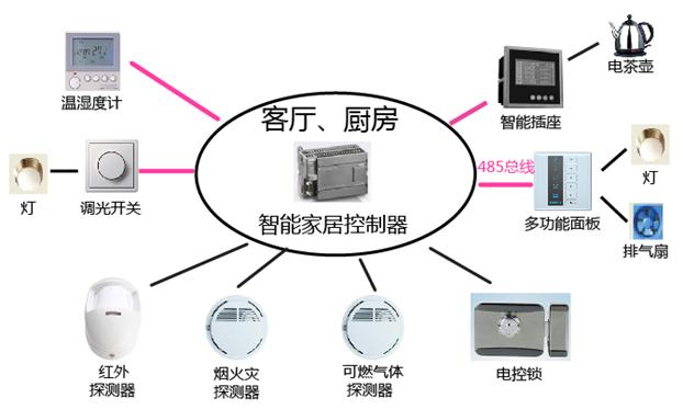 智能電子產(chǎn)品系統(tǒng)網(wǎng)絡(luò)示意圖 1. 家庭控制中心說明: 客廳廚房控制中心 客廳廚房控制中心包含智能家居控制器、電控鎖、多功能面板、節(jié)能燈、排氣扇、智能調(diào)光開關(guān)、智能光強(qiáng)及溫濕度計(jì)、智能插座、電茶壺、可燃?xì)怏w探測(cè)器、煙火災(zāi)探測(cè)器及紅外探測(cè)器。 電控鎖通過智能家居控制器控制門的開啟;多功能面板控制客廳、廚房燈的開關(guān);智能調(diào)光開關(guān)調(diào)節(jié)LED燈的亮度、也可通過485總線與智能家居控制器通訊,通過情景模式智能調(diào)節(jié)LED燈的亮度;智能光強(qiáng)及溫濕度計(jì)顯示采集客廳溫濕度及光照度;智能插座控制和采集電茶壺的電源和電量信息,可合理分配用電負(fù)荷;可燃?xì)怏w探測(cè)器、煙火災(zāi)探測(cè)器及紅外探測(cè)器用于組件家居系統(tǒng)的安防系統(tǒng)。 多功能面板、智能調(diào)光開關(guān)、智能光強(qiáng)及溫濕度計(jì)、智能插座通過485總線與智能家居控制器通訊,可燃?xì)怏w探測(cè)器、煙火災(zāi)探測(cè)器、紅外探測(cè)器及電控鎖通過I\O口與智能家居控制器通訊。
