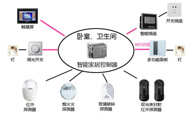 智能電子產(chǎn)品系統(tǒng)客廳廚房安裝配置圖 臥室衛(wèi)生間控制中心 臥室衛(wèi)生間控制中心包含智能家居控制器、觸摸屏、多功能面板、智能調(diào)光開關(guān)、智能插座、煙火災(zāi)探測(cè)器、紅外探測(cè)器、玻璃破碎探測(cè)器、雙光束對(duì)射紅外探測(cè)器。 觸摸屏通過485與智能家居控制器通訊,可實(shí)現(xiàn)遙控、遙信、遙調(diào)及情景模式的設(shè)定;智能調(diào)光開關(guān)調(diào)節(jié)白熾燈的亮度、也可通過485總線與智能家居控制器通訊,通過情景模式智能調(diào)節(jié)白熾燈的亮度;多功能面板控制臥室、衛(wèi)生間燈的開合;智能插座控制和采集相關(guān)用電設(shè)備電源和電量信息,可合理分配用電負(fù)荷;煙火災(zāi)探測(cè)器、紅外探測(cè)器、玻璃破碎探測(cè)器、雙光束對(duì)射紅外探測(cè)器用于組件家居系統(tǒng)的安防系統(tǒng)。 觸摸屏、多功能面板、智能調(diào)光開關(guān)、智能插座通過485總線與智能家居控制器通訊,煙火災(zāi)探測(cè)器、紅外探測(cè)器、玻璃破碎探測(cè)器及雙光束對(duì)射紅外探測(cè)器通過I\O口與智能家居控制器通訊。